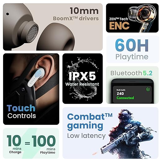 Boult Audio Z40 True Wireless in Ear Earbuds with 60H Playtime, Zen™ ENC Mic, Low Latency Gaming, Type-C Fast Charging, Made in India, 10mm Rich Bass Drivers, IPX5, Bluetooth 5.3 Ear Buds TWS (White)