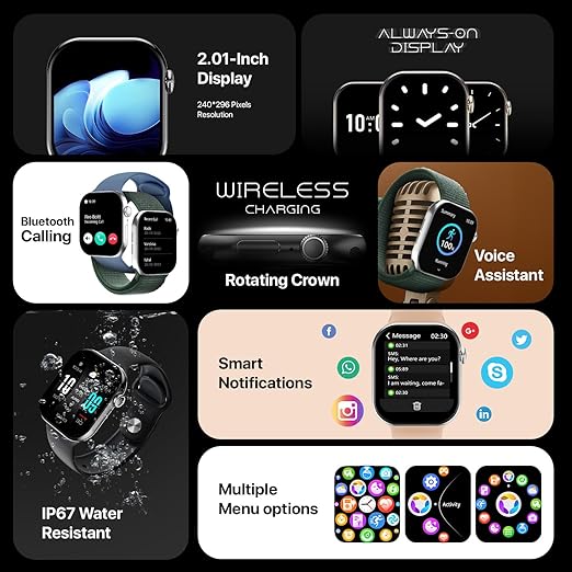 | Special Feature | 2.01" IPS Display, 240x296 pixel High Resolution, 2.5D curved Multiple touchscreen, Always ON screen, Bluetooth Calling , Voice Assistance, 100+ Sports Mode Tracking, In Built Mic & Speaker, Accelerometer, Activity Tracker, Alarm Clock, Breathe, SpO2, Heart Rate Tracking, One-tap connection, Workout activity training guide in App, Download Puzzle Games, Calorie Tracker, Camera, Daily Workout Memory, Distance Tracker, bedside lamp, female physiology, Pinlock function, Multisport Tracker, Music Player, Notifications, Pedometer, Phone Call, Sedentary Reminder, Sleep Monitor, Text message, Time Display |